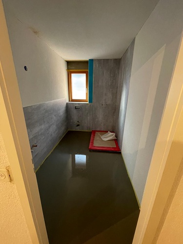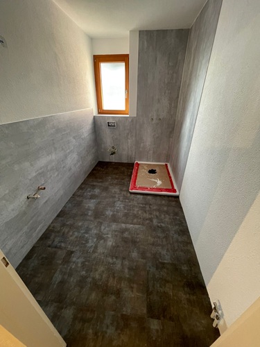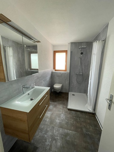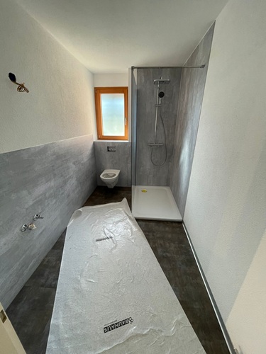 Solution: Le revêtement mural est renouvelé à l’aide des panneaux HPL et d’un enduit. De plus, l’ancienne douche, le lavabo ainsi que les WC sont remplacés par des appareils sanitaires modernes. Le sol est refait avec un revêtement en vinyle facile d’entretien.